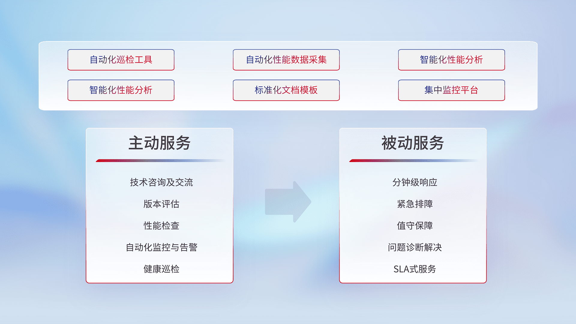 智能化工具和标准化文档,,保障服务质量,,,提供主动服务(包含技术咨询、、、、版本评估、、、性能检查、、、、自动化监控与告警、、健康巡检)和被动服务包含(分钟级响应、、紧急排障、、值守保障、、、、问题诊断解决、、、SLA服务)。。。